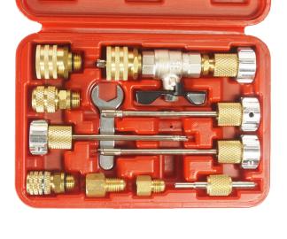 Применение комплекта позволяет заменить клапаны кондиционера без разгерметизации системы и потери хладагента. В комплект входит фиксирующее приспособление, которое удерживает шток клапана во время замены клапана. В комплекте: Клапан. Стандартный съемник клапана. Стандартный съемник клапана GM большого диаметра. Съемник клапана JRA R134. Съемник клапана Вольво (Volvo) и 8 мм. Коннектор R134а HØ16. Коннектор R134а LØ13. Коннектор поворотный 5/16"FL. Коннектор поворотный 1/4"FL. Адаптер 1/4"Мх3/16"F. Адаптер 1/4"Мх1/2"F ACMEF. Ключ М14. Съемник клапанов линий высокого и низкого давления. Габаритные размеры: 200/135/40 мм (Д/Ш/В) Вес: 814 г