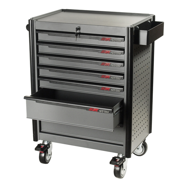 Оборудована большой прочной пластиковой ручкой. Корпус тележки оснащен защитными бортами, что сводит к минимуму риск повреждения оборудования и нанесения травм автомеханикам во время перемещения по СТО. Одновременно может быть открыт только один ящик. Конструкция ящика учитывает все требования по безопасности эксплуатации. Роликовые направляющие с функцией автоматического возврата обеспечивают плавность открывания/закрывания секций. Колеса размером 5""x2"", изготовленные из термопластичного каучука, обеспечивают легкое и бесшумное перемещение тележки. Выдвижные ящики оснащены нескользящими вкладками. В комплекте предусмотрен верхний коврик из АБС, предназначенный для удобного хранения различных мелких деталей. Перфорированные боковые стенки с квадратными отверстиями предоставляют возможность разместить дополнительные аксессуары для хранения инструментов. Применяется с серией подвесных приспособлений JTC- 3218. Порошковое покрытие поверхности защищено от царапин и устойчиво к воздействию растворителей. В комплект входит полка для размещения тары JTC-5637. Габаритные размеры: -/-/- мм. (Д/Ш/В) Вес: - гр.