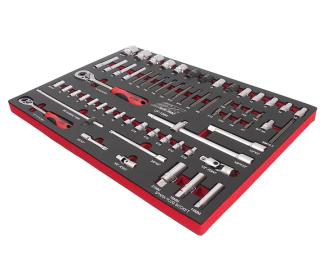 В комплекте: Головки 1/2"Dr.х6 граней: 12-16, 18, 22, 24, 27, 30, 32 мм. Ударные головки 1/2"Dr.х6 граней: 17, 19, 20 мм. Головки глубокие 1/2"Dr.х12 граней: 10, 12, 13, 14 мм. Удлинители 1/2"Dr.: 5", 10". Трещотки: 1/2", 3/8". Переходник карданный: 1/2", 3/8". Переходник 3/8"(F)х1/2"(М). Биты Torx 10 мм. (длина 30 мм.): Т40, Т45, Т50, Т55. Биты Spline 10 мм. (длина 75 мм.): M8, M9, M10, M12. Биты Torx 10 мм. (длина 75 мм.): Т30, Т40, Т45, Т50, Т55. Биты Ribe 10 мм. (длина 110 мм.): M10S (T52). Головки 3/8"Dr.х6 граней: 8, 10-17 мм. Головки Torx 3/8"Dr.: E10, E12, E14, E16, E18. Головки под свечу зажигания 3/8"Dr.: 14, 16, 21 мм. Удлинитель 3/8"Dr.: 3", 6". Вороток с плавающей головкой 3/8". Общее количество предметов: 63 шт.