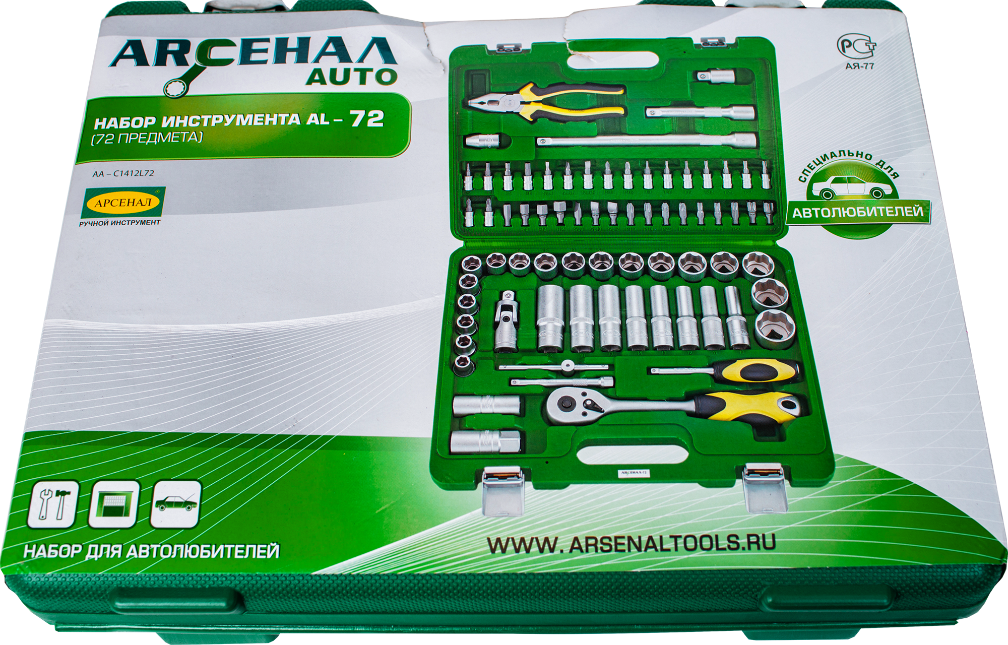 Набор инструментов ARSENAL AA-C1412L72 состоит из 72 предметов, изготовлен из качественной хром-ванадиевой стали и предназначен для ремонта легкового автотранспорта. Комплектация набора оптимальна и отлично подходит для гаража любого автолюбителя. Инструменты упакованы в удобный пластиковый кейс.