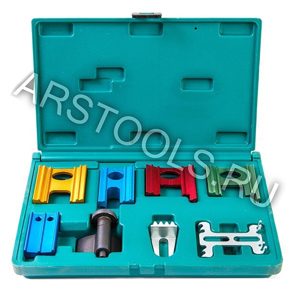 Набор для фиксации распредвалов JONNESWAY AI010037 048483 состоит из 8 предметов. Комплект специальных приспособлений, которые применяются в процессе работ по обслуживанию ГРМ ДВС, а также при замене приводного ремня ГРМ автомобилей.